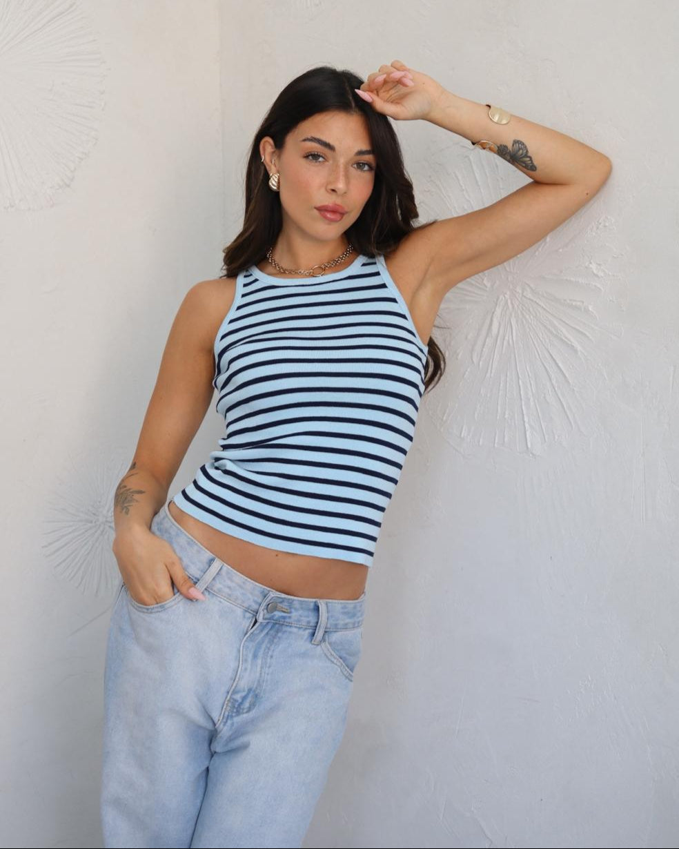 גופיית פסים בסגנון קז'ואל קיצי בגזרה מחמיאה, עשויה בד סריג רך ונעים למגע.