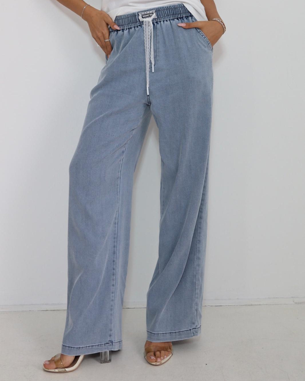 מכנס קז'ואל מושלם בגזרה מתרחבת, עשוי בד דמוי ג'ינס קליל ונעים למגע בשילוב עיטור ושרוך תחרה, כיסים קדמיים ואחוריים.